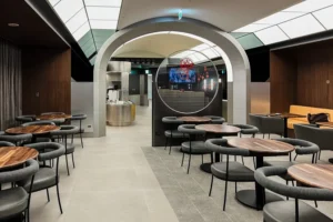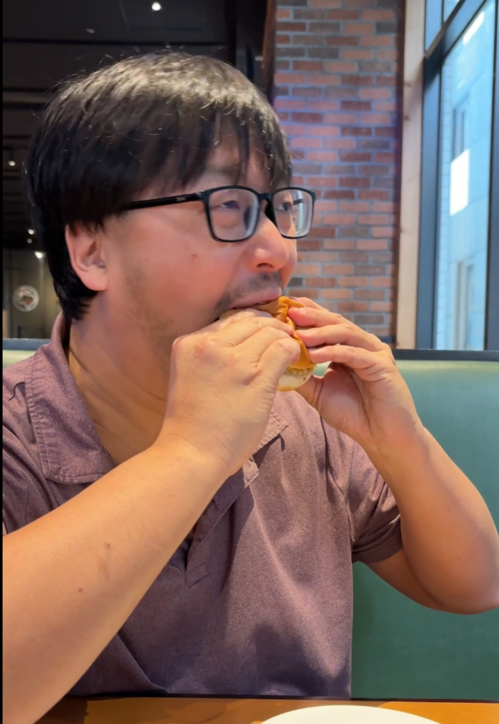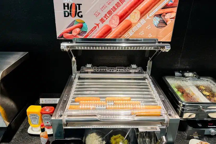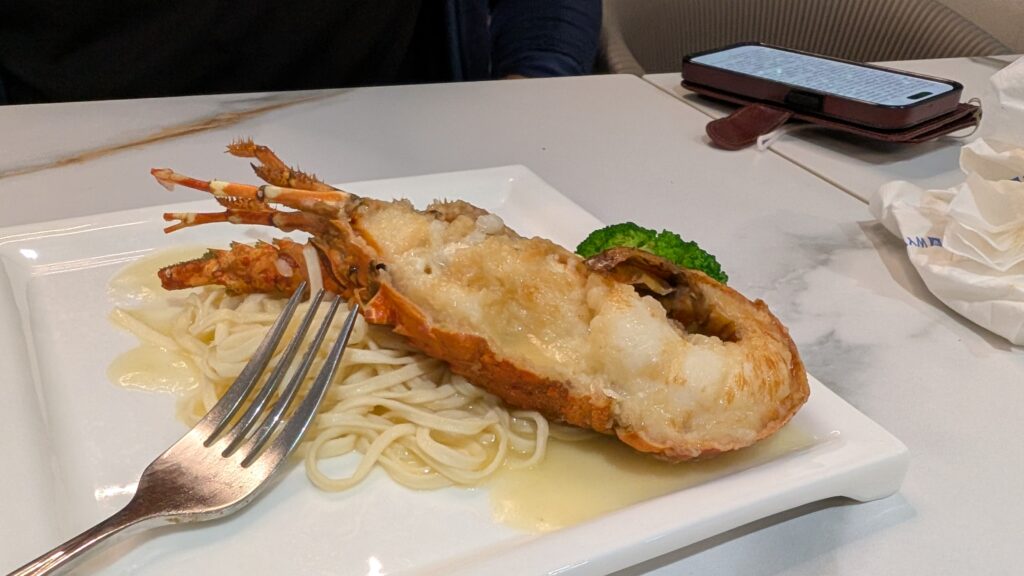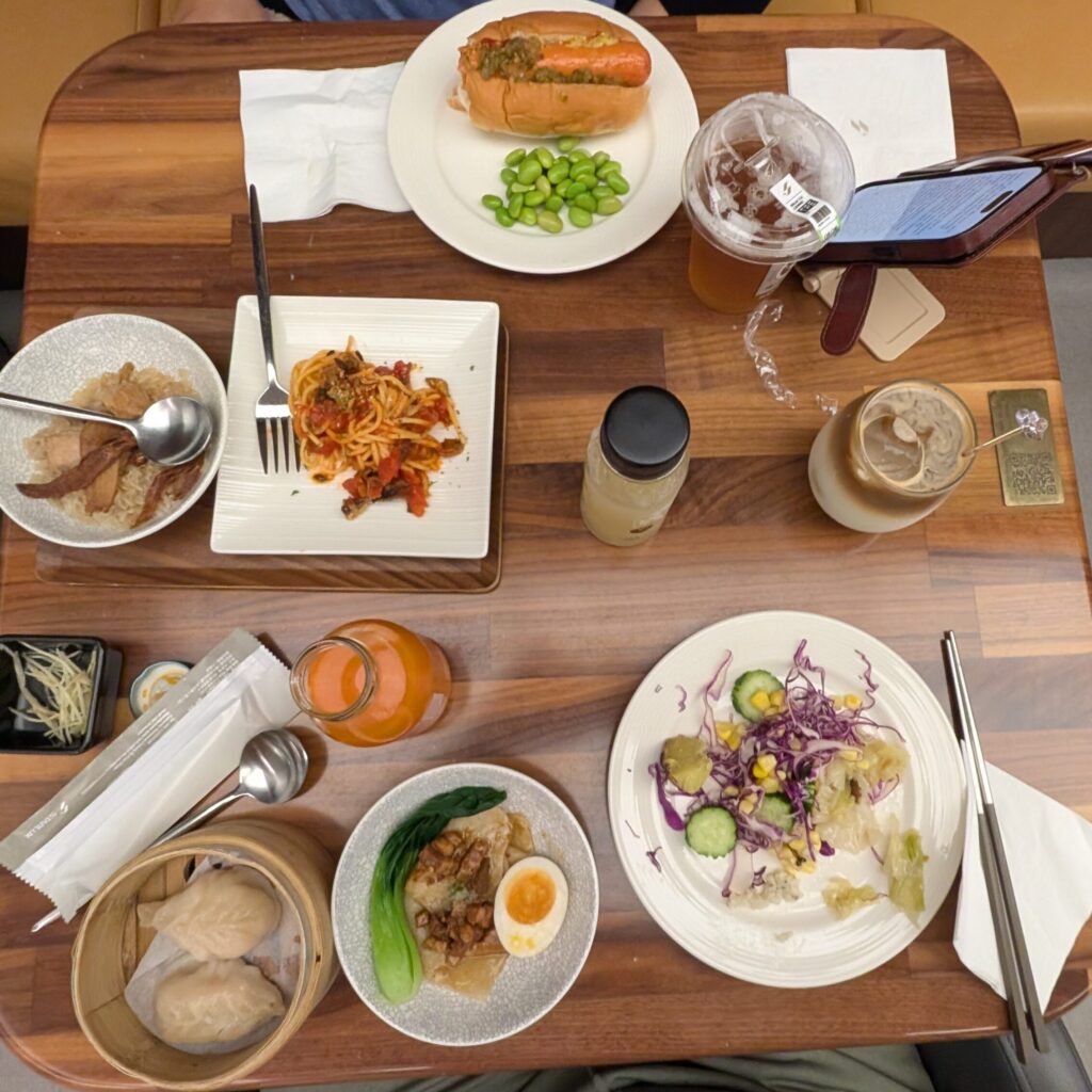 We took our return TPE-LAX flight on Starlux JX2 J. We started at their spaceship-themed “Galatic Lounge” but ended up going to the Oriental Club Lounge, which has more comfortable seats. The lounge was a bit gimmicky, a bit like being in a Star Wars-themed cafeteria in Disneyland. When you go to the bathroom, you push a round button to open the door, and both sides slide aside as if gas-motorized, and the bathroom lights up with whit lights along with some red and yellow accent lights. There are some spaceship-themed decorations scattered across the lounge. The buffet area has only basic side menus, and main dishes have to be ordered via the QR code. Unlike other QR code menu systems, this one was easier to use – it has a “cart system” and allows multiple users to coordinate their “carts” into a single order. The food was quite nice. They also had a “make your hotdog” station, where they have a handful of hotdogs rolling on a grill, just like you could see in convenience stores.