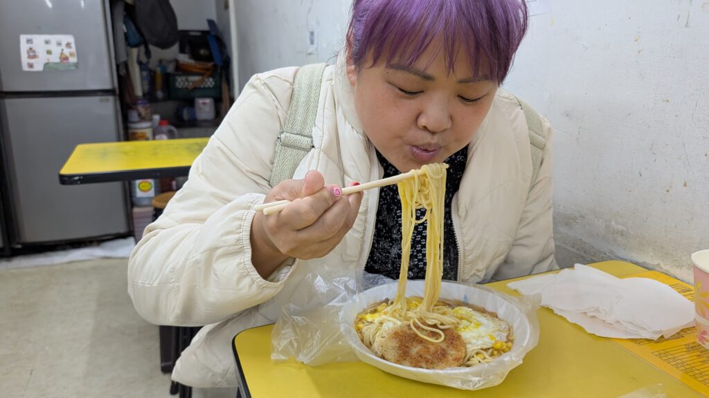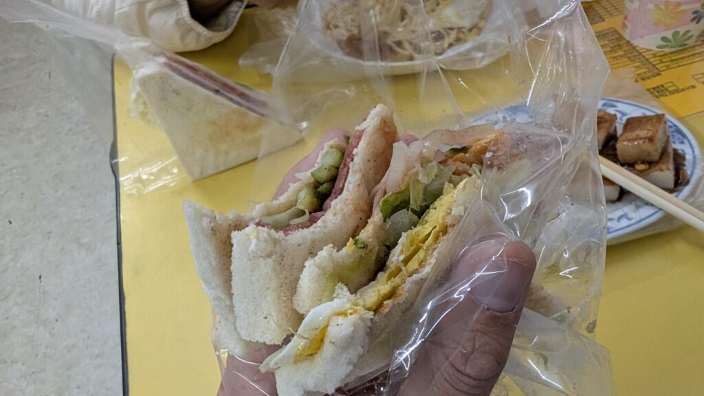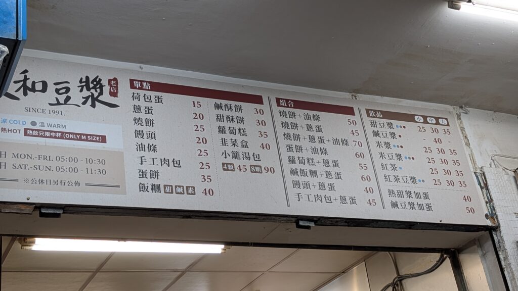 The informal eateries are incredibly basic – kind of like a taco truck in a tiny store space. The kitchen is towards the front of the eatery, and the person does double duty handling payments and cooking at the same time. Breakfast items are often 20-100 NTD (between $1 and $3 USD). In the cheaper places, I noticed that there’s this trend where the plate comes wrapped in plastic, so once the guests leave, there’s no need to wash anything – just replace the plastic and it’s ready to go. We even got noodle soup in a bowl wrapped in plastic. And the silverware was often in what seemed like a UV sterilization machine for customers to pick up themselves. Half of the informal eateries had a printout of their menu in English and handed it out when requested. Christine managed to communicate with people in Mandarin language. Sometimes though the conversation was more complex than we could handle, so we also relied on taking photos of the menu with the Google Translate app.