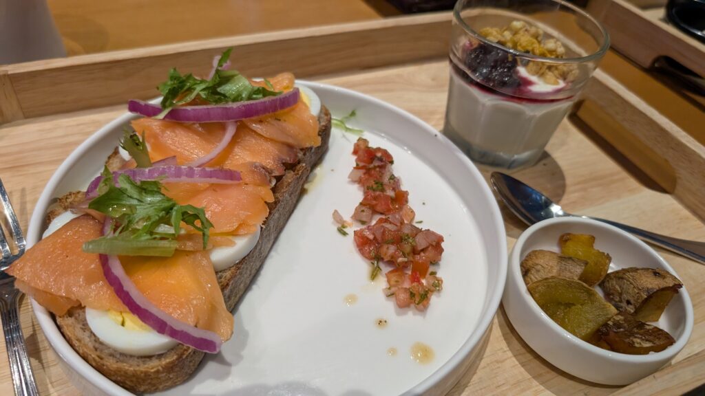 When flying in economy, I just stow my backpack under my seat and I can access it relatively easily during the flight. In business, there’s no underseat stowage – items have to go either in the compartments or in the overhead bin, and getting things from the overhead bin is a bit of an operation so I can’t be doing it often. I’m starting to develop a routine when boarding these cabins. Bring a small shoulder bag inside the backpack, and once inside, bring out the shoulder bag and use it as my extended pocket during the flight. Stash all the unnecessary items in the overhead bin – safety cards, menu cards, headsets, amenity kit, and my shoes. Then load the trays with my bluetooth headset, laptop, ipad, phone stand, bluetooth keyboard, mouse, USB cables. Then before breakfast, swap out the items and load my shoulder bag with the passport and entry card. Although on this flight I barely used the laptop and iPad. I’ll need to try this out a couple times until I figure out how much to reasonably unpack.