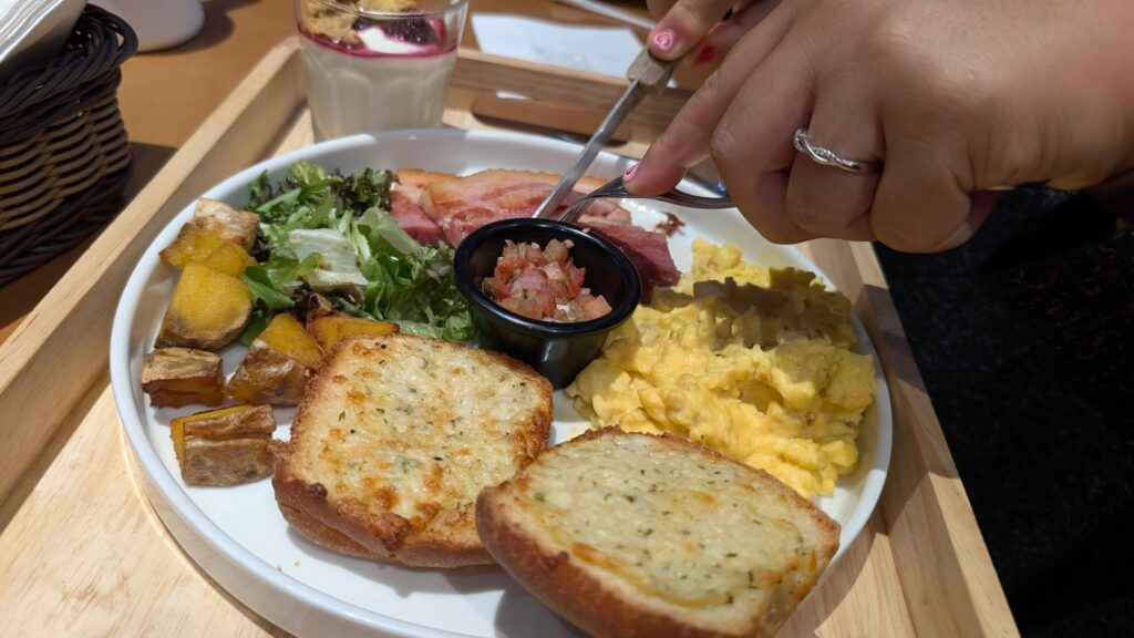 The Wyndham lounge overlooks an outdoor courtyard with shaded couches with a view of the lake. On our first day, we grabbed the desserts and tried to walk out to the courtyard but the glass door was locked. I was unlocking the door when the hotel staff caught me and told us that we were not allowed to open that door. Once we were done eating, however, we could walk out of the lounge and enter the courtyard through a side door. This is because the courtyard is open to all hotel guests I think.