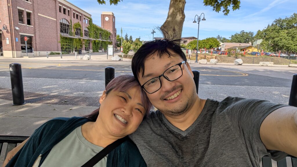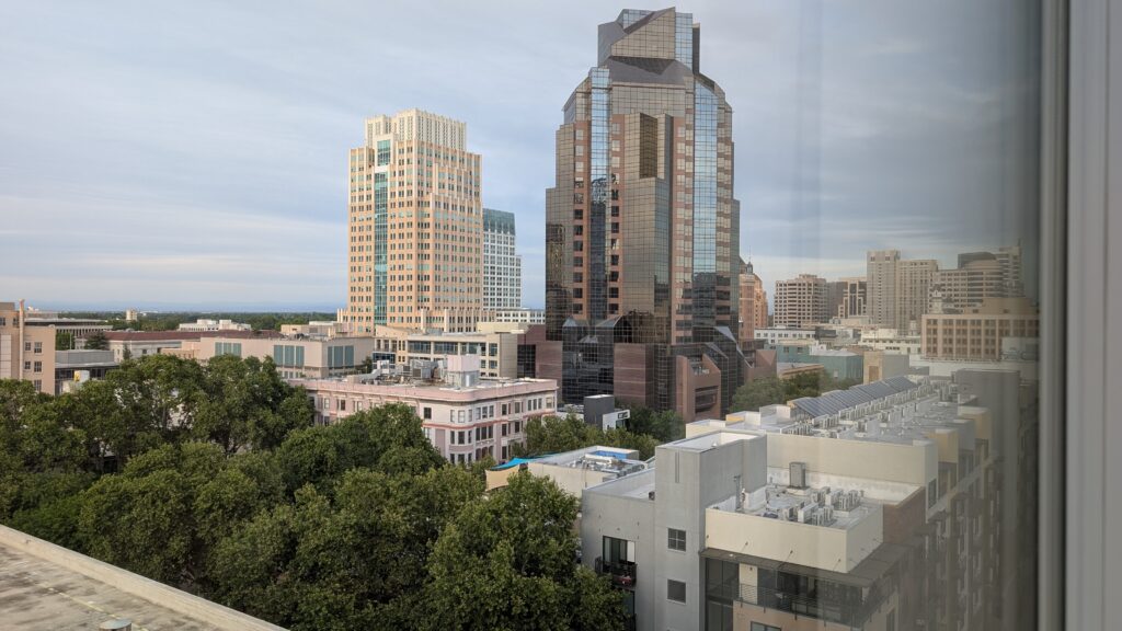Retracing a journey I took fifteen years ago, we spent this past weekend in Sacramento to explore the bike paths I first discovered when cycling twenty miles north for a wedding. We arrived on Friday afternoon at the Hyatt Centric in the DOCO shopping mall after a slight bus delay; there was a forty-minute gap between the 11:40 AM and 12:30 PM buses, and the latter arrived ten minutes late.
