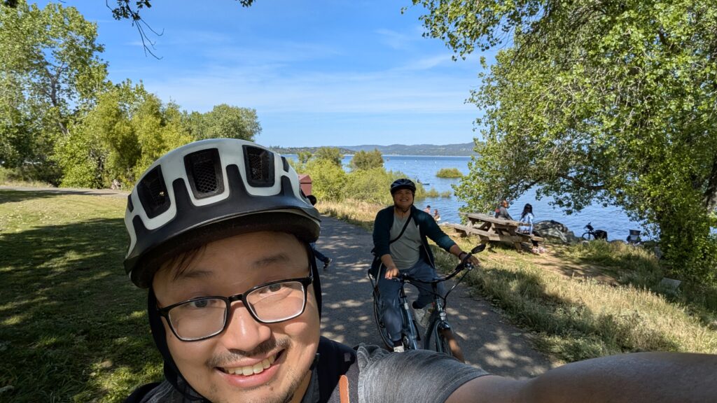 The ride had a brief scare when Christine’s e-bike wouldn’t start after we stopped for dumplings. We almost sought help at a nearby Trek store before the owner of Practical Cycle explained over the phone that there is a reset switch under the motor, which acts as a safety feature if the kickstand is down. Once resolved, we biked to the Beals Point Recreation Area peninsula, where we saw hundreds of people swimming, paddleboarding, and picnicking. While I considered biking the full two hours back to downtown Sacramento, we were both too tired and decided to return the bikes in Folsom.