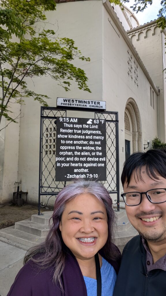 On Sunday, feeling a bit sore from the exercise, we searched for a progressive and multicultural church and ended up at Westminster Presbyterian. While it was affirming and progressive, it wasn’t particularly multicultural – a lot of white seniors and middle-aged members. The atmosphere gave off a welcoming “AA meeting” vibe due to the seating in an annex room and the coffee station in the back. Still, progressive and affirming.