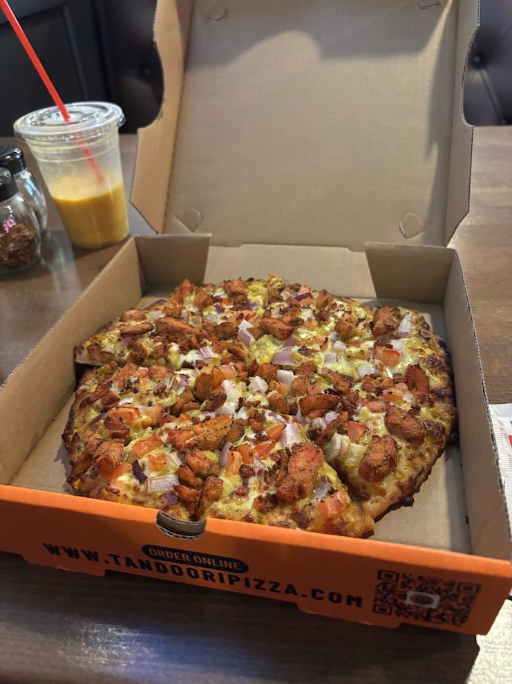 On our way to the bakery, we caught a glimpse of Columbia Bank, which featured an incredibly old-school layout reminiscent of the bank scenes in the movie Catch Me If You Can. For dinner on Saturday, we visited Tandoori Kitchen for a butter chicken pizza, which was so filling that I ended up finishing my half slowly after some initial nibbling. Other meals included Panda Express, which we ate in a nice courtyard in DOCO near the cornhole games, and an early 3:00 PM dinner at Chipotle on Sunday.